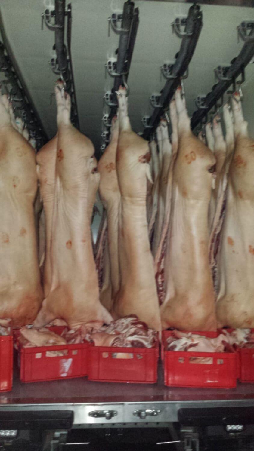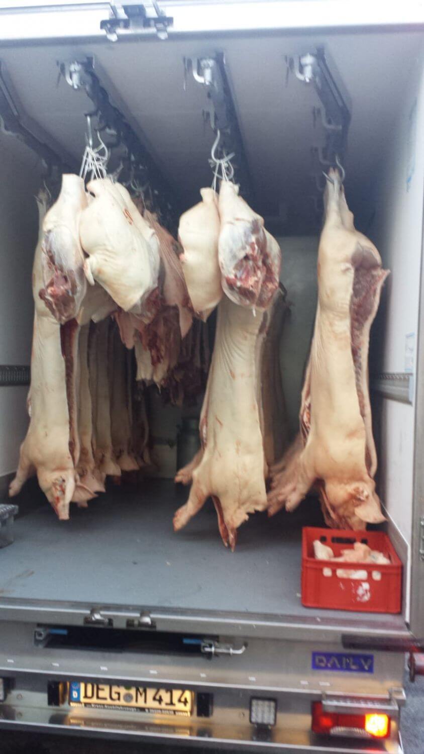 Unsere Kühltransporter transportieren die Schweinehälften und –teile ein paar Stunden nach der Schlachtung zu den jeweiligen Metzgereien. Schlachtungen erfolgen nur am Wochenanfang auf Bestellung. Bei uns wird nichts eingelagert.